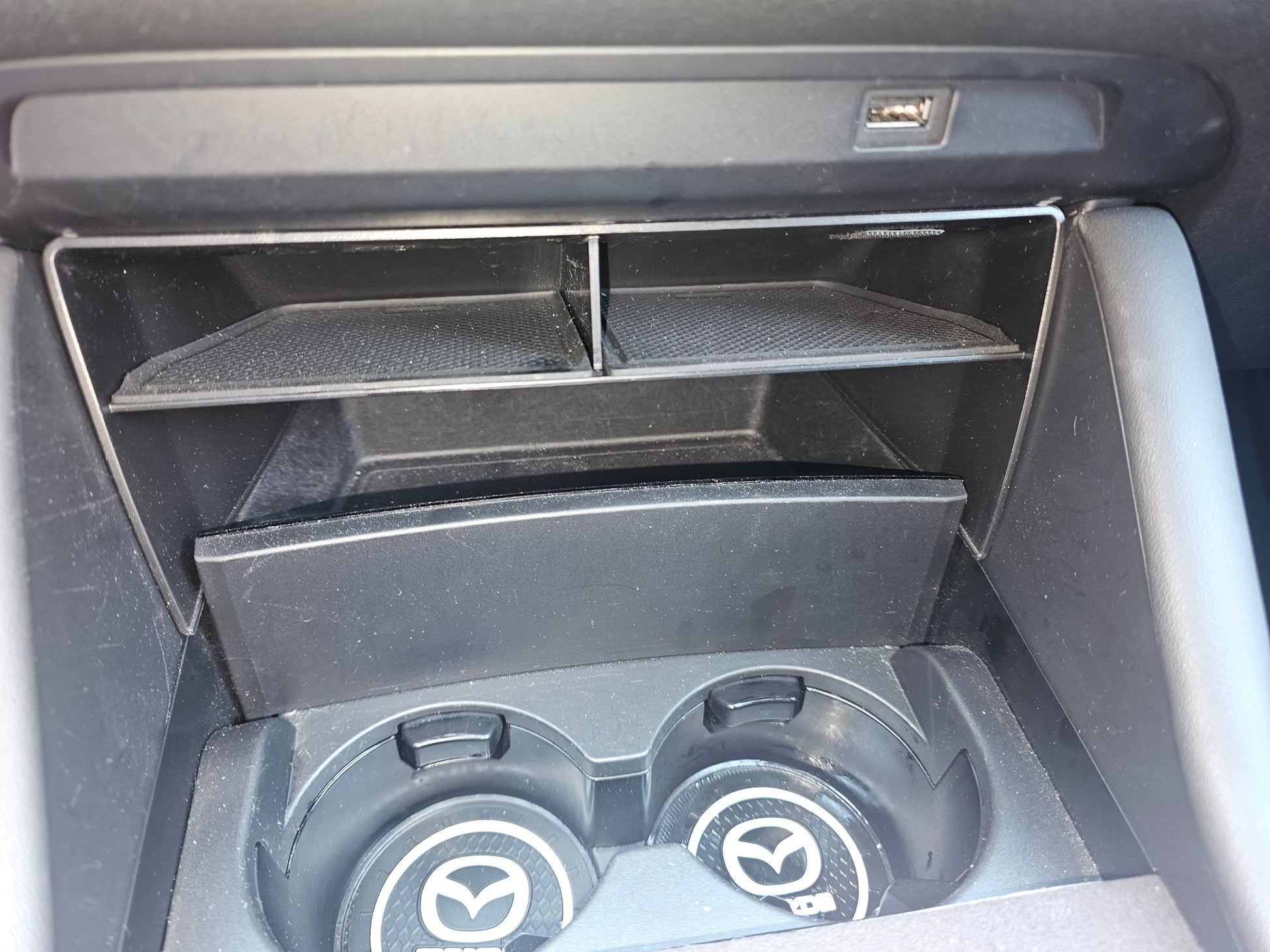 Transform your center armrest space with this functional storage box custom-designed for the 4th generation Mazda 3 Compact and Sedan (BP and Sedan) 2019 - 2025. Thanks to its double level, it allows you to keep small items accessible while optimizing the organization of your cabin. A discreet, but essential accessory for a clean, structured and efficient interior.