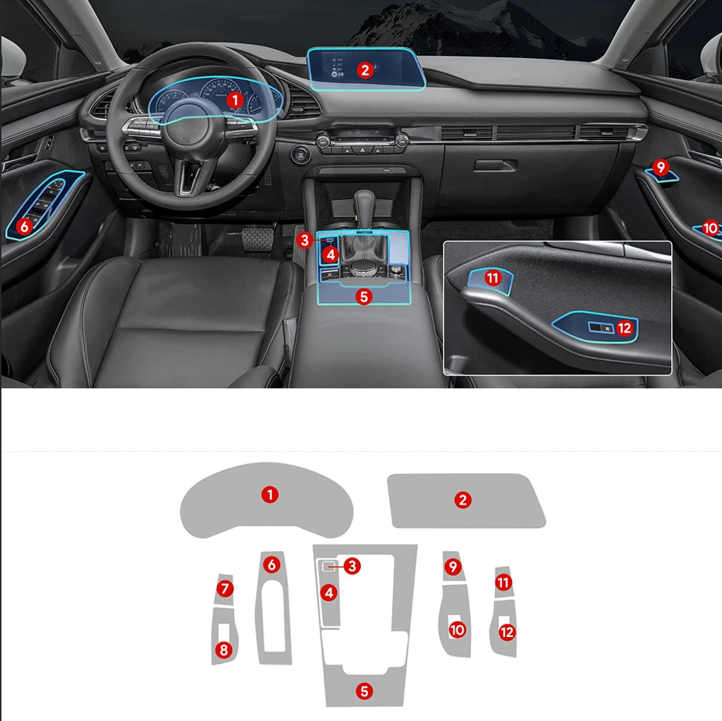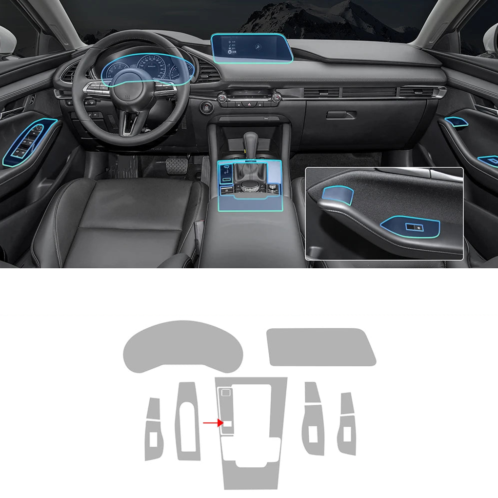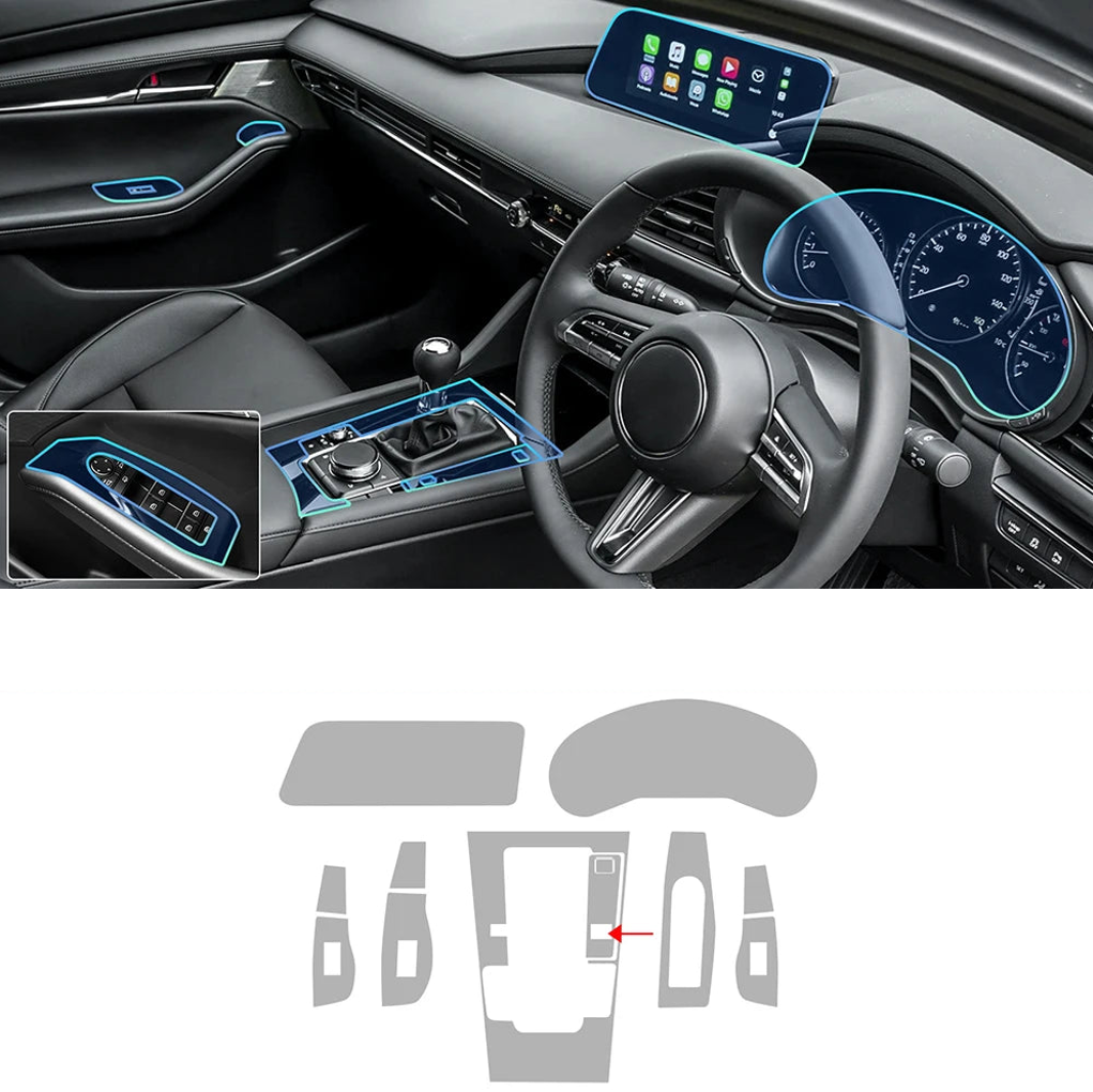 Effectively protect the sensitive interior elements of your Mazda 3 with this set of high-transparency TPU films . Tailor-made for the screens (8.8" navigation), center console, gear lever and instrumentation, these anti-scratch films are discreet, durable and ensure a premium finish while extending the life of your interior.